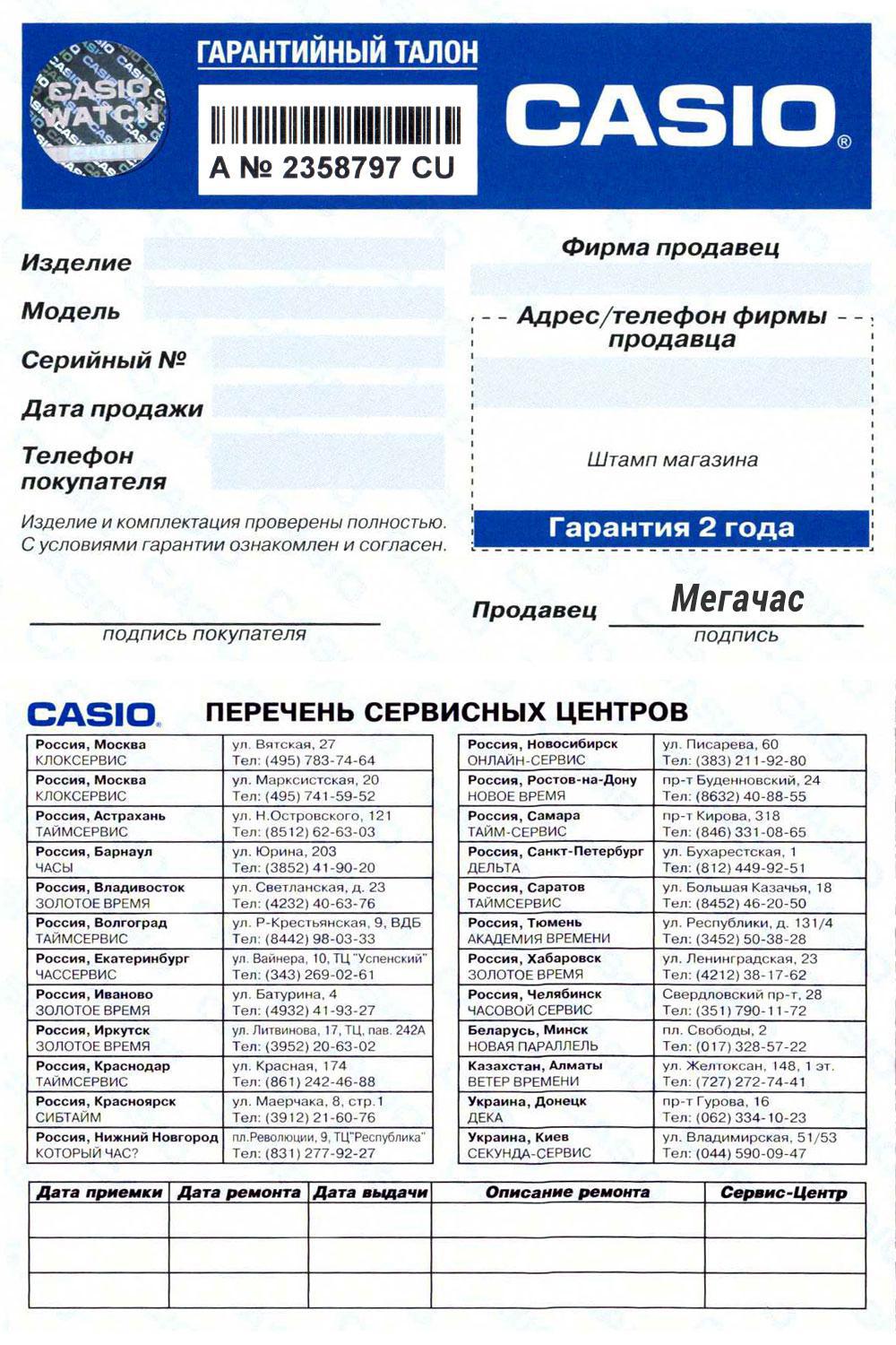 - - Международный гарантийный талон (только для линейки Casio G-Shock)